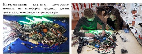 Очень интересны объекты проекта «Мусоротроника», например, арт-картины, снабженные датчиками и исполнительными устройствами. Датчик движения улавливает человека, который приблизился к картине, исполнительные устройства (светодиодные ленты и кулеры) включаются, картина оживает. Большой интерес среди учащихся вызывает работа над «умными подставками» под ноутбуки, организацией рабочих мест из водопроводных труб и т.д.