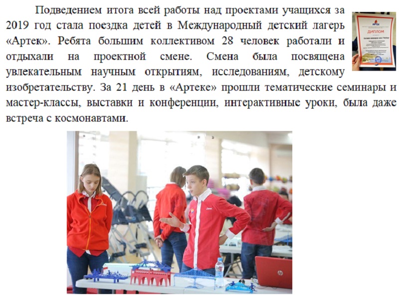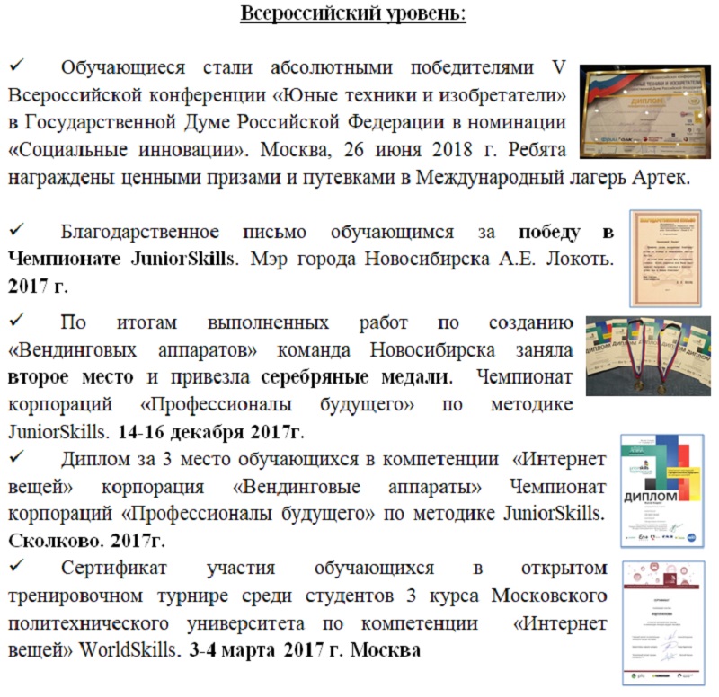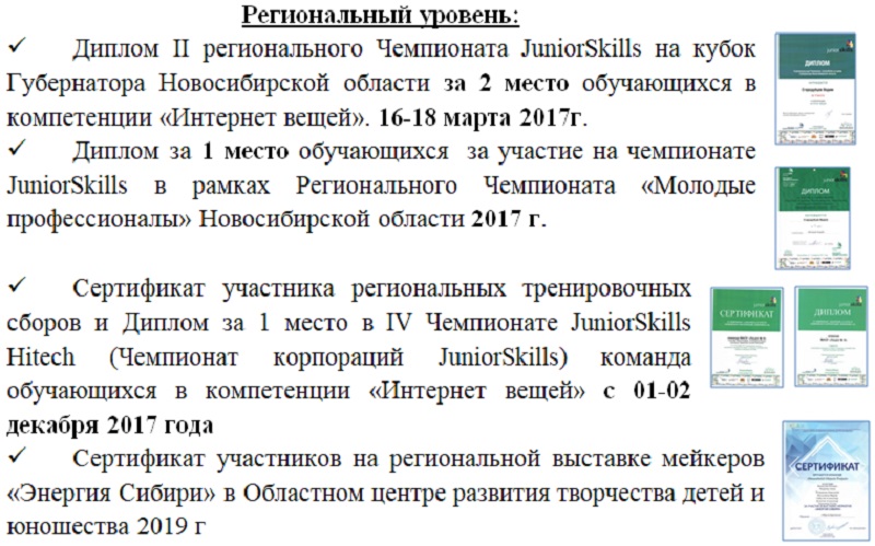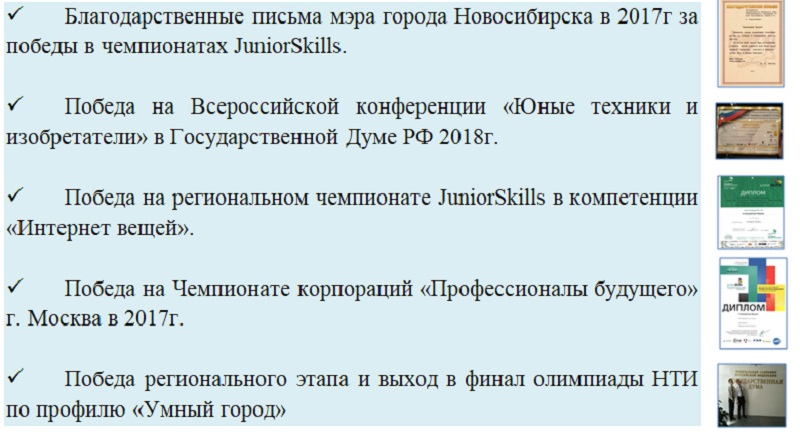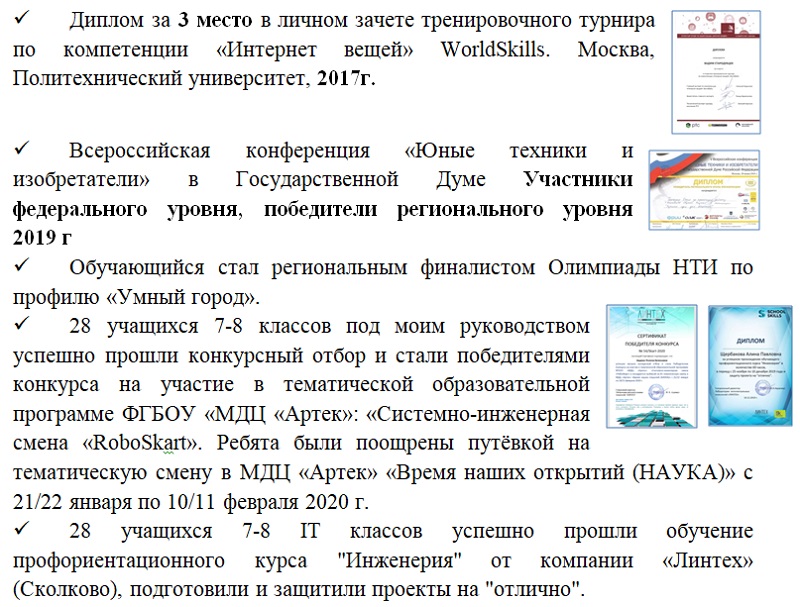 Мои ученики получают высокие награды за проекты в различных конкурсах и соревнованиях. Среди них можно выделить следующие достижения: