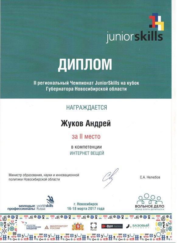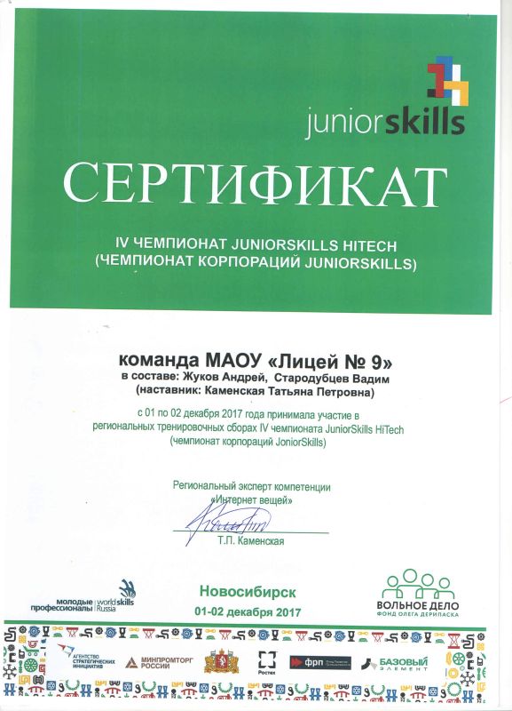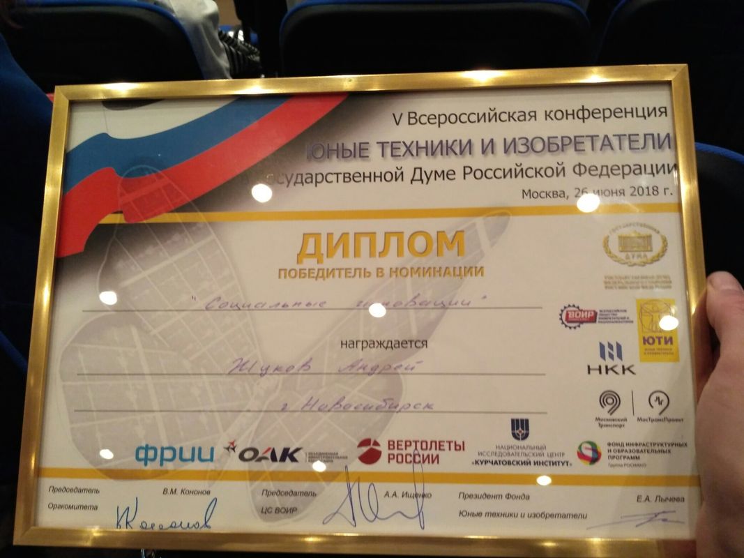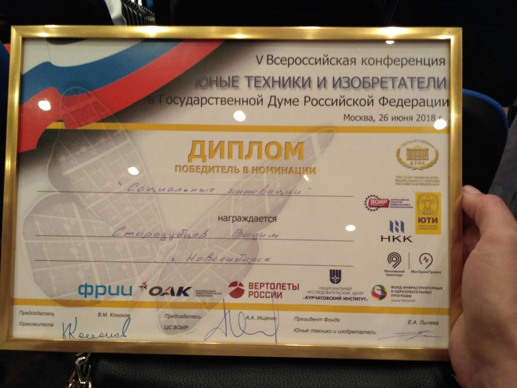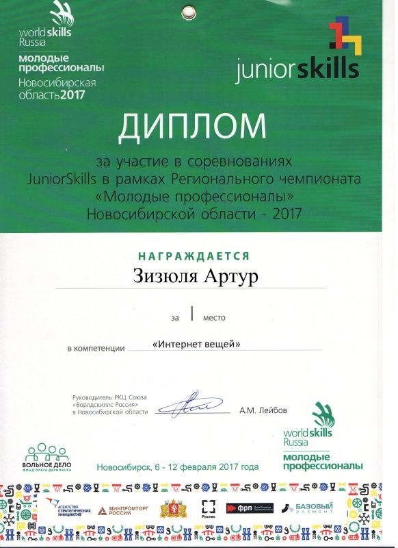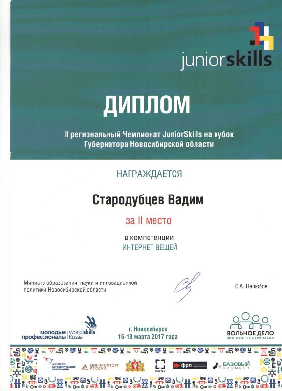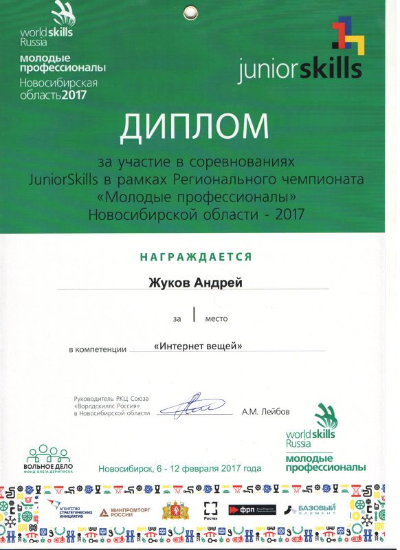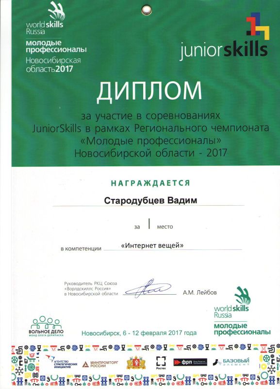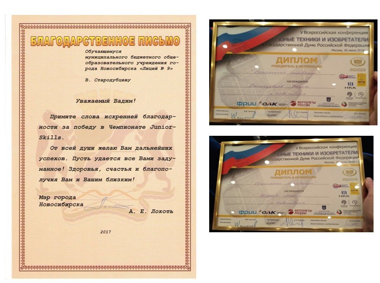 Учащиеся Стародубцев В., Зизюля А. и Жуков А. – победители Чемпионата JuniorSkills и Всероссийской конференции «Юные техники и изобретатели» в Государственной Думе. Ребята могут рассчитывать на президентские гранты после поступления в вузы, имеют именные благодарственные письма мэра города Новосибирска.