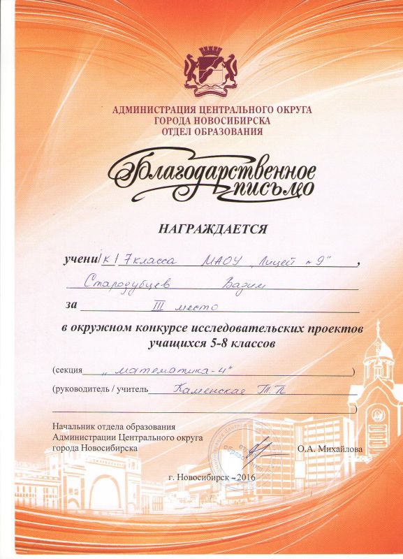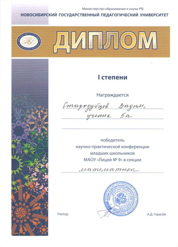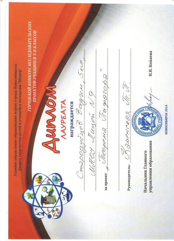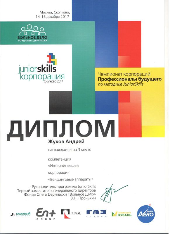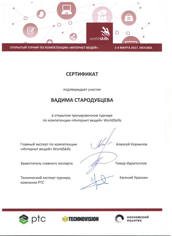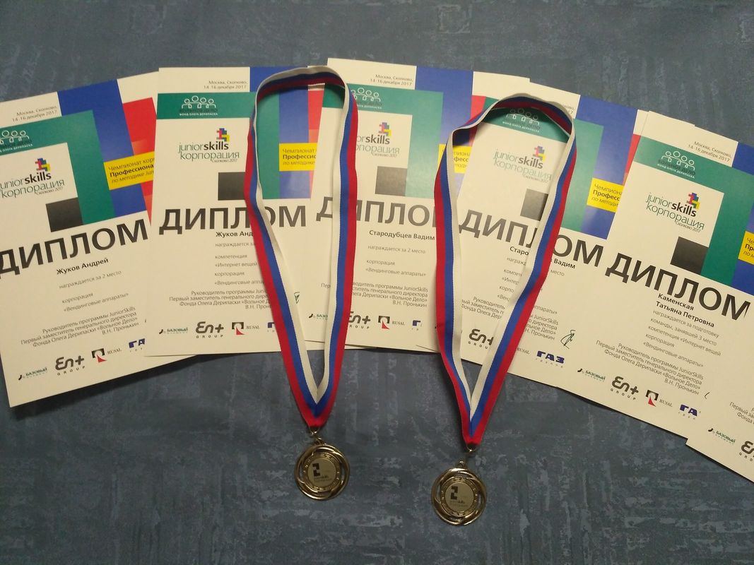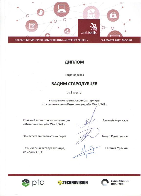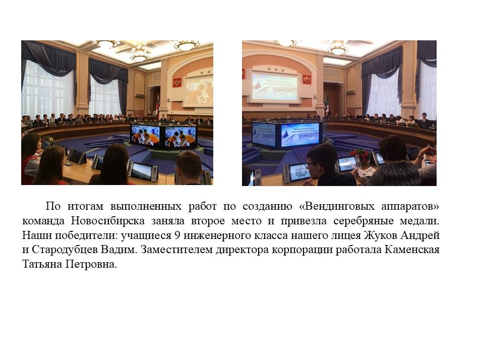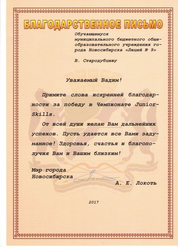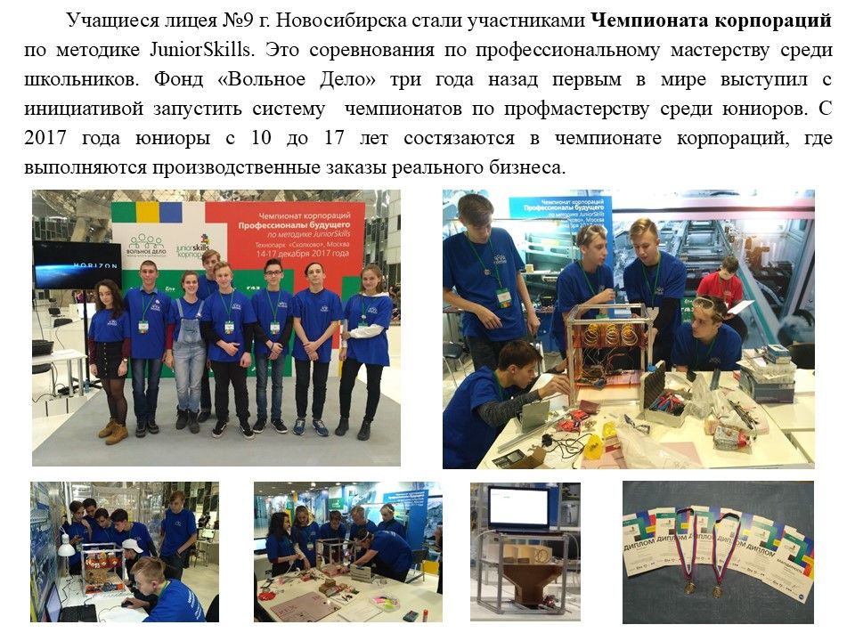 Учащиеся Стародубцев В., Зизюля А. и Жуков А. – победители Чемпионата JuniorSkills и Всероссийской конференции «Юные техники и изобретатели» в Государственной Думе. Ребята могут рассчитывать на президентские гранты после поступления в вузы, имеют именные благодарственные письма мэра города Новосибирска.